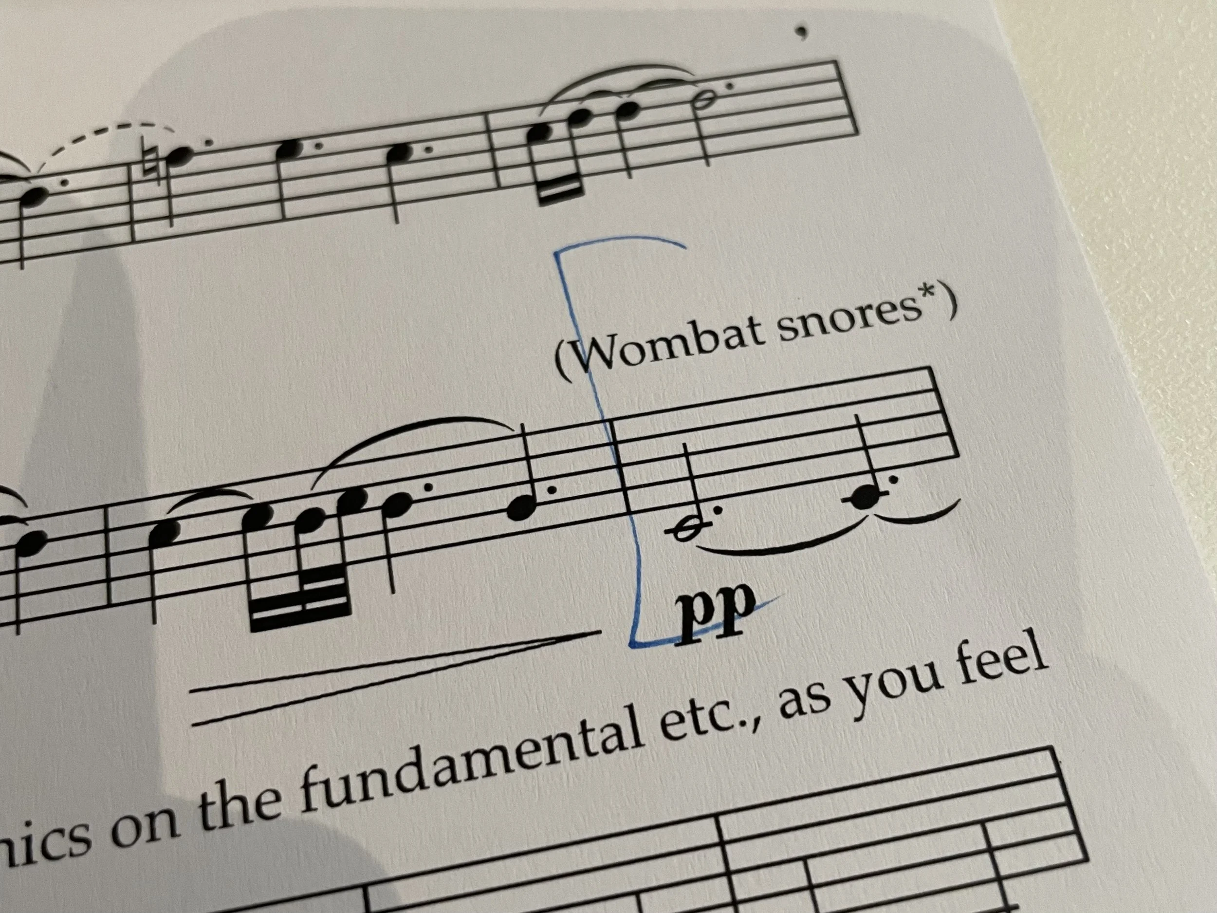 Pictured above: The snoring section of the Song of the Wombat score. It’s my nightmare that someone who has never heard my music before might only ever hear the snoring section of this piece. Please, listen to the whole thing, hahahahaha…