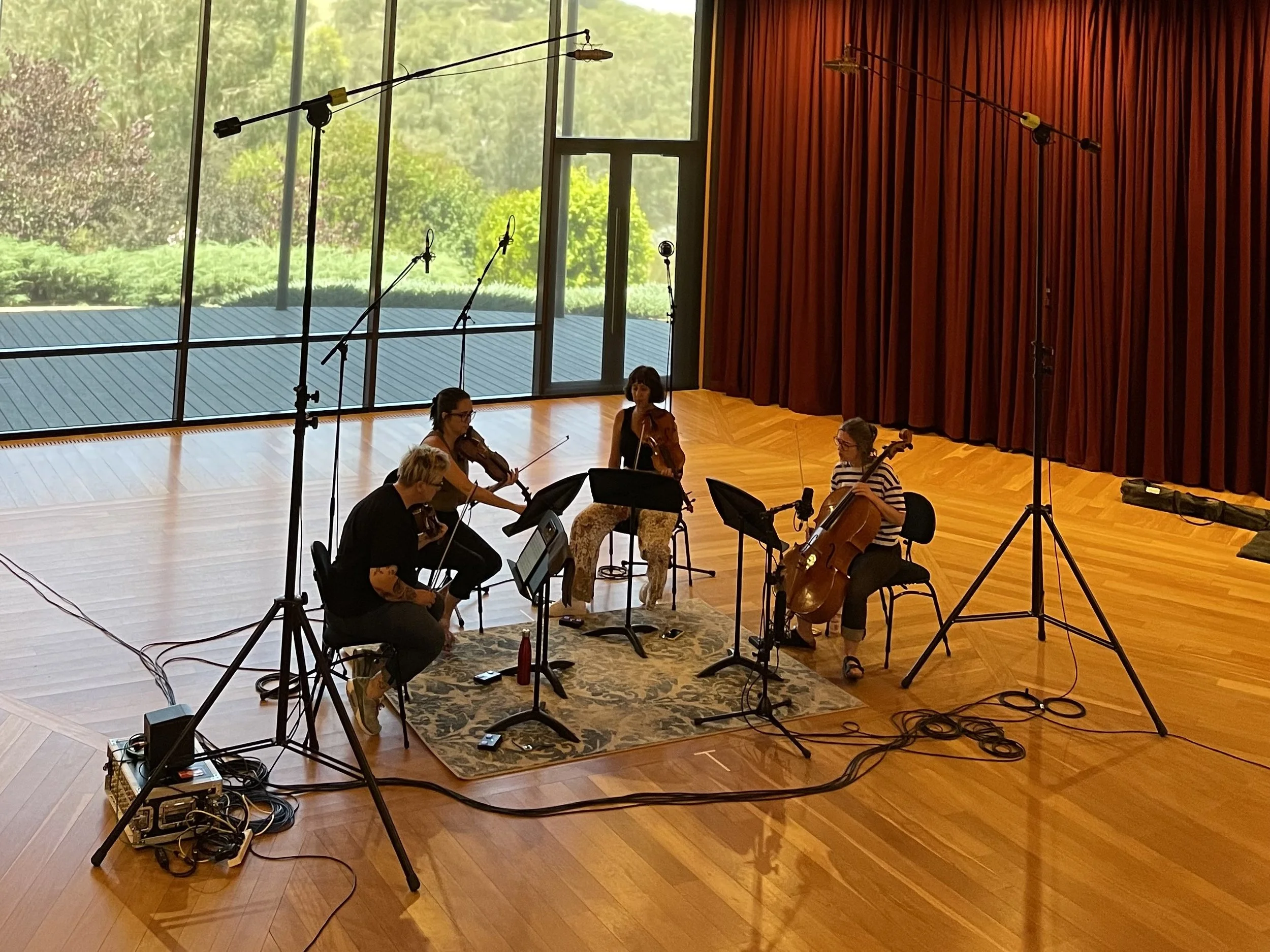 Pictured above: String quartet recording day at UKARIA, December 2024, with Belinda and Emily (violins), Karen (viola), and Anna (cello)